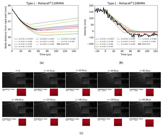 Once the validity of the numerical model was established, simulations were attempted for the dynamic cases. Figure 15 shows a comparison between the experiment and the numerical simulations for foam Type L (Rohacell® 110RIMA) under dynamic compression. The same approach was adopted for all the other impact cases (Figure 16a,b). High values of allowed quicker initial velocity reductions and smaller specimens deformations, whilst smaller values led to more compliant responses. The best match was found when using plateau stress values between 5.2 MPa and 7.0 MPa. Variations of X between 0.005 and 0.04 did not significantly affect the initial response of the virtual specimen, but only the rebound velocity. Comparing the snapshots of the simulation and experiment in Figure 15c, it is possible to note a small discrepancy in the specimen length, which increased with time. The virtual specimen appeared to recover its initial geometry at a faster rate compared to the real specimen. In order to capture recoverable plastic deformations, a more refined stress vs. strain behaviour should be used. Moreover, more advanced material cards, such as MAT_FU_CHANG (MAT_83) or MAT_MODIFIED_CRUSHABLE_FOAM (MAT_163), could also be used to obtain a closer correlation with this particular type of foam. Nevertheless, MAT_63 showed an excellent ability to capture the compressive behaviour of a variety of foams [29].