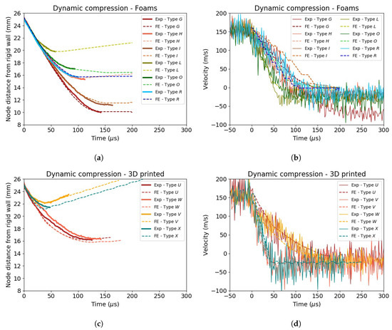 Comparison between experimental and FE results for foams and 3D printed specimens. (a,c) Crash distance vs. time; (b,d) velocity vs. time.