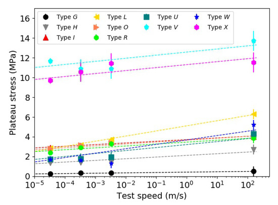 The values of the plateau stress used for the simulations are plotted in Figure 17 along the experimental values. It is possible to see that the plateau stress values increased with increasing the test speed. The enhancement in at 10% strain was quantified between 4% and 87%. A linear relationship between the plateau stress values and the logarithm of the test speed for all the investigated materials also appeared to exist. Although the R-squared fit values for the foams were close to unity, a worse correlation was found for the 3D printed materials. This could be associated with the higher variability in the experimental test data along the plateau region, which was not constant up to the densification initiation strain. These results were in agreement with results reported in the literature. For example, Ibrahim [30] noted a 40% increase of the plateau stress of PMI foams when the test speed increased from 0.127 mm/s to 12.7 mm/s. Krundaeva et al. [31] noted an increase of of about 70% for EPS foams tested at strain rates between 10 s−1 and 100 s−1. Strength enhancement was found in specimens 3D printed with ABS when tested in tension under strain rates between 0.0127 mm/min and 100 mm/min [32] or in compression [33].