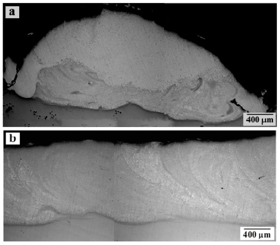 It can be seen that, using the low-power 1000-W laser (Figure 2a), we obtain a bumpy coating whose thickness (on the ridge and in the cavity) can vary by almost five times. When the laser power doubles (Figure 2b), the coating becomes more uniform in thickness (difference does not exceed 16%). A similar trend in coating technology using additive technology was also noted by Schmidt et al. [9].