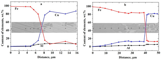 In the course of this study, in the transverse sections corresponding to the contact point of steel and the bronze coating, the X-ray microanalysis was performed, which confirmed the diffusion of copper and aluminum from bronze to steel (Figure 7). The study also found diffusion of aluminum and copper into iron dendrites permeating the microstructure of the coating itself.