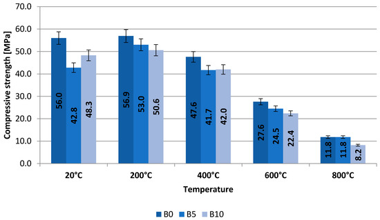 The highest strength was recorded after heating up of the samples to the temperature of 200 °C after 180 days of curing, i.e., 56.9 MPa for B0 samples, 53.0 MPa for B5 samples, 50.6 MPa for B10 samples. The compressive strength was reduced by 6.85% and 11.07% respectively. Samples heated at higher temperatures, i.e., 400, 600, and 800 °C have been found to have a bigger reduction of compressive strength as compared to samples made of control concrete. Heating up of composite in the above specified temperatures caused a decrease in strength by 12.39–11.23–0% respectively (concrete B5) and 11.76–18.84–30.51% (concrete B10). A smaller content of recyclate in the mixture has a more advantageous impact on the strength of samples heated up at fire temperatures.