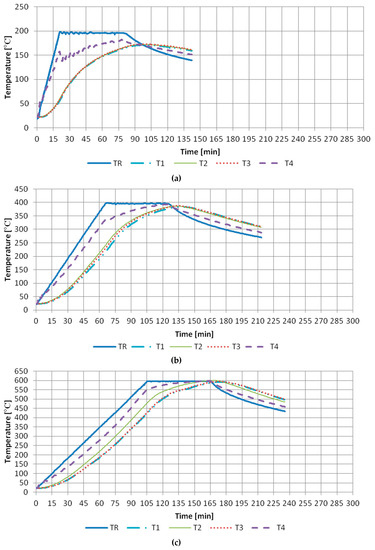 First the samples were dried in a laboratory drying device to achieve a constant mass with temperature of 105 ± 5 °C. The signal from the thermocouples was registered by a computer furnished with dedicated software. The temperature distribution was monitored with the use of four thermoelements furnished in the specially drilled witness sample (Figure 2). The opening for the first heating element (T1) was executed in the central part of the sample, the next one (T2) 25 mm from the edge of the base and (T3) 10 mm from the base edge, at the depth of 50 mm. The last thermocouple (T4) was attached to the lateral side of the sample. The regulating thermoelement (TR) is inserted via the posterior wall and remains close to the furnace ceiling.