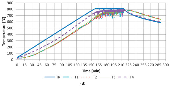 Heating curves. Temperature distribution in pilot sample for concrete composite B5: (a) 200 °C, (b) 400 °C, (c) 600 °C, (d) 800 °C.