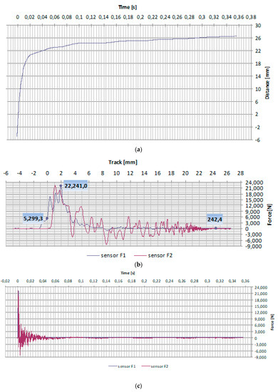 Example of results obtained during the impact strength test: (a) time–distance, (b) force–distance, (c) force–time.