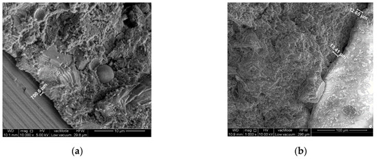 The obtained results enabled the qualitative assessment of the structure and phase composition of hardened composite. The reference concrete contains grains of hydrated calcareous silicate that is interconnected in the form of compact gel. According to Diamond’s classification [58] it conforms to morphological types III and IV of the C-S-H phase. Deformations and cracks were formed in the concrete occurring on the point of contact of the cement–aggregate matrix with residue adhesions of phase C-S-H. The cracks constitute intercluster areas of the division surface. This proves the occurrence of critical strains in the structure. Locally the material loses its strength and consistence of the matrix (Figure 8, Figure 9 and Figure 10). Cracks are recorded on the border glass aggregate—mortar (Figure 9) ranging between 2–3 µm for composite B5 heated up at 20 °C and cracks of a size of 85–100 µm for composite B5 heated at 800 °C. Composite B10 heated up at the temperature of 20 °C was found to have cracking having a width of 0.7 µm, while the temperature of 800 °C generated cracks with a magnitude of 12–13 µm.