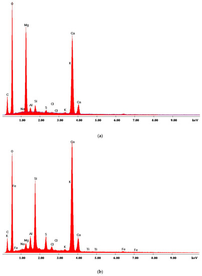 Example diffractogram of the analyzed area of modified concrete composite: (a) 20 °C, 5% of glass; (b) 800 °C, 5% of glass.