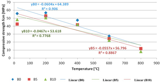 The objective of the next test was to verify the subsequent research presumption. The presumption assumed a connection of temperature at which the element with compressive strength of concrete composite is heated up. The obtained correlation was illustrated on Figure 12. The correlation was depicted as a linear function of regression (yB0, yB5, yB10) and the determination coefficient was specified (square of correlation coefficient R2). The variability of the average compressive strength of concrete is explained by a temperature variability of 90.60, 88.67, 77.68% respectively for the following correlation coefficients 0.95; 0.94; 0.88.