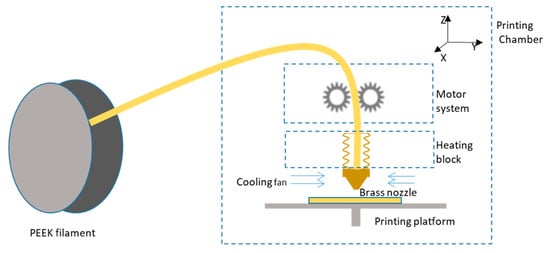 Many techniques are used for the production of porous PEEK for medical applications. Traditional manufacturing process methods include injection molding, extrusion, compression molding, machining, and so on []. Additionally, advancements in additive manufacturing (AM) continue to provide new opportunities for biomedical applications by enabling the creation of more complex architectures, e.g., for tissue engineering scaffolding and patient-personalized implants. The selective laser sintering (SLS) technique was used a decade ago in PEEK 3D printing, which is a type of powder-based AM technology. It is capable of fabricating porous PEEK-based composites with very complex architectures, permitting greater freedom of design []. Both 3D systems and EOS have commercialized PEEK in their SLS machines. However, the high cost and concentrated laser beam restrict it from sintering large areas or laminates. Another power-based technique is also applied in PEEK printing. In 2019, Lee et al. [] reported their efforts toward 3D printing of PEEK by direct-ink writing technology at room temperature, which was enabled by a unique formulation comprised of commercial PEEK powder, soluble epoxy-functionalized PEEK (ePEEK), and fenchone. This combination formed a Bingham plastic that could be extruded using a readily available direct-ink write printer. Besides the techniques mentioned above, fused deposition modeling (FDM) is currently the most widely used 3D printing strategy and low-cost technology for thermoplastic materials []. In the FDM process, a filament is extruded from a nozzle continuously while heated to a semiliquid state, then the filament rapidly adheres with the surrounding material and solidifies, and the deposits follow a certain routine to form the desired shape []. The schematic of an FDM PEEK printer is showed in Figure 1. Despite a large number of publications on extrusion-based AM of porous structures using other materials than PEEK [], there are few reports dealing with the AM of small PEEK parts, especially samples without defects such as warpage or delamination.
