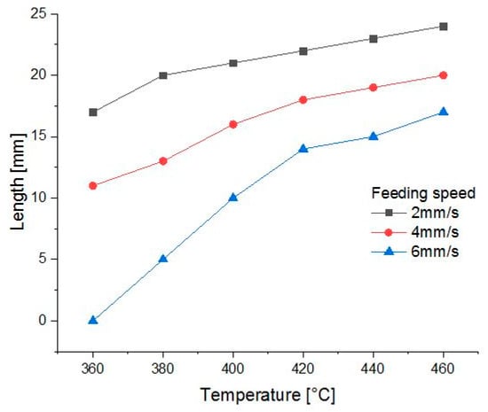 Viscosity of the material should also be taken into consideration during the FDM procedure. Wang et al. [] made a finite element analysis (FEA) of PEEK material in the flow channel of the nozzle to explore reasonable printing temperatures. According to their experiment, the heating temperature of the printing head, wire feeding speed, and diameter of the nozzle are the key parameters influencing the distribution of the temperature field, viscosity field, and pressure field. To summarize from their experiment, higher temperature and slower feeding speed guarantee a longer length of the liquid column in the nozzle (Figure 3), and therefore confirm better processing possibility of the material.