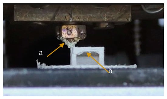 A shot of the 3D printer in the processing of DC4430 PEEK. (a) The residual material sticking to the nozzle. (b) The structure defect of sample.