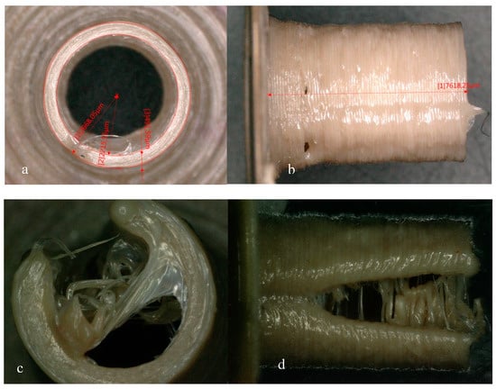Barrels printed with radius of 3 mm and wall thickness of 0.5 mm by Apium HPP155 with two software. (a,b) Samples printed by software installed in the printer, and (c,d) are printed by Simplify 3D, respectively.
