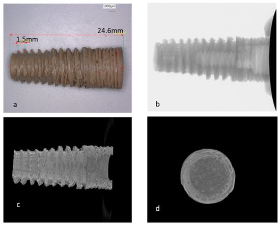 CT of a magnified dental implant produced with Apium HPP155 ((a) is the printed implant, (b–d) are micro CTs of the sample).