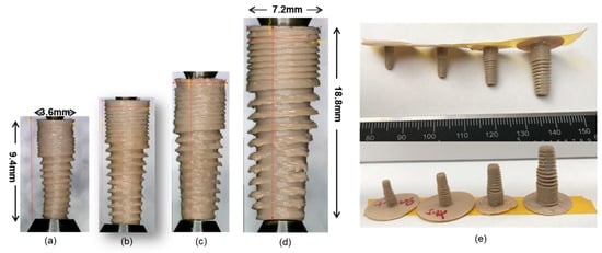 Dental implants printed with Orion Generation 2 ((b–d) are ×1.2, ×1.5, and ×2 scale of a separately; (a,b) are printed with a 0.15 mm nozzle at the temperature of 405 °C; (c) is printed with a 0.2 mm nozzle at a temperature of 390 °C; (d) is printed with a 0.4 mm nozzle at a temperature of 390 °C, (e) is the group photo of the above samples).