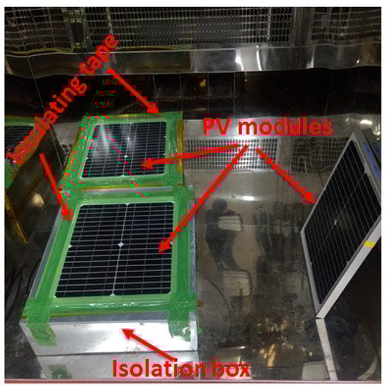 The PV modules were mounted on a concrete slab to protect the back surface from exposure in an environment [18]. The back surface of the PV modules was isolated from the environment by fixing on the metallic isolation box (filled with concrete), and the gap between the metallic wall and frame of the PV module was covered with insulating tape. The PV module without concrete, in which the backside of the PV module was unprotected, was used as a reference PV module. Figure 1 shows the optical images of PV modules in the thermal cycling chamber. The PV modules were taken out from the environmental chamber after every 20 cycles for I-V and electroluminescence (EL) measurements and appearance.