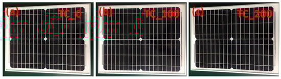 In this study, the c-Si PV modules were fixed on a concrete slab using an isolation box and insulating tape to reduce the heat flow toward the back surface of the PV modules. Thus, two PV modules with a concrete slab were analyzed, while other PV modules without a concrete slab were used as a reference. It is worth noting that the use of the concrete leads to an improvement of the normalized power values compared to that of a reference PV module. I-V characteristics were measured periodically (after every 20 cycles) during the TC test (200 cycles) to profile the progression of degradation. The optical images of the reference PV module before and after TC (100 and 200) cycles are shown in Figure 2. However, Figure 3 shows the optical images of the PV module with the concrete slab before and after TC (100 and 200) cycles. For the further investigation of the performance degradation, some of the performance parameters of the PV modules (maximum power Pm, short-circuit current Isc, open-circuit voltage Voc, and efficiency η) were extracted from the I-V curves, and their dependency on the thermal cycling was discussed concerning the EL images.
