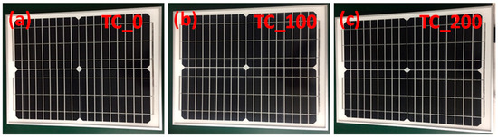 The study has been carried out on monocrystalline PV modules (approximately 20 W) with an area of 1540 cm2. The rigid modules included 36 cells, with an Al frame (cell area = 31.2 cm2). The modules were subjected to a thermal cycling (TC) test to evaluate the ability of the module to withstand thermal mismatch, fatigue, and other stresses caused by temperature fluctuations. The test was conducted using an environmental chamber equipped with an automatic temperature control (−40 to 85 °C). The TC stress was conducted using a chamber (NEC EC−1100, M/s. NET Co. Ltd., Suwon, Korea). First, the temperature of the environmental chamber was decreased from 25 °C to −40 °C in 35 min; then, the temperature was kept constant at −40 °C for 30 min. The temperature was increased from −40 °C to 85 °C in 90 min.