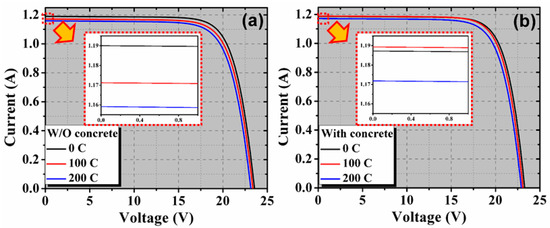 Illuminated I-V curves after thermal cycling of 0, 100, and 200 cycles for PV module (a) without concrete and (b) with concrete. The inset shows a magnified part to see the difference in the Isc values.