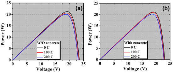 Illuminated P-V curves after thermal cycling of 0, 100, and 200 cycles for PV module (a) without concrete and (b) with concrete.