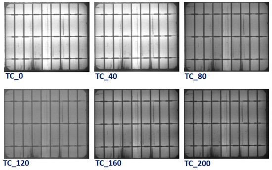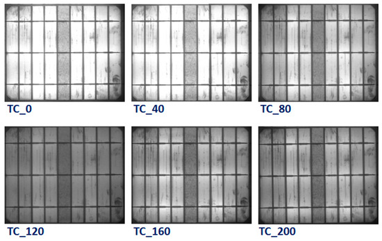 To identify the specific degradation mechanisms and module defects that manifest during the TC test, EL images were taken for all modules. Figure 7 shows the EL images of the reference PV module after different thermal (0, 40, 80, 120, 160, and 200) cycles. There was no obvious change in the EL images of the reference module up to 40 thermal cycles, while the brightness of the EL has diminished in all the areas of the module after 40 cycles. As a result of the extreme temperatures changes during the thermal cycling test, the electrical connections in the PV module are practically stressed. Thus, thermal fatigue-induced defects lead to an increase in the series resistance of the cells, which directly contributes to power degradation. It is well known that the thermal stresses can weaken the electrical connections and soldering in the module and therefore increase the contact resistivity. The serial resistance Rs increases, and consequently, the maximum power of the module decreases. EL images of the PV module with concrete are displayed in Figure 8. The EL results also showed similar behavior with the appearance of dark areas during the TC test. However, the darkness of the EL images in the concrete PV module is lower than the reference module. It can be inferred from these results that a lower number of defects was generated in the PV modules with concrete, which revealed that the impact of TC stress on the PV module containing a concrete slab is smaller than the reference module. This confirms that the impact of the temperature on the PV modules can be reduced through using concrete, which eventually enhanced the performance lifetime of the PV modules.