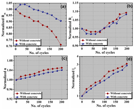 The performance parameters are directed via PV cell parameters. The origins of the degradation in the performance parameters can be investigated by analyzing the PV cell parameters of the PV cells/modules. The degradation of the performance parameters can also be explained via the PV cell parameters, whose variation is shown in Figure 9. The value of Rsh of the PV module with concrete is initially increased with the increase in the number of thermal cycles. The Rsh value up to 80 cycles is slightly higher than the initial value (before thermal cycling). With a further increase in the thermal cycle, the Rsh value started to decrease. However, the Rsh value of the reference PV module is constantly decreasing with the increase in the thermal cycle. For the reference PV module, both the surface (front and back) are exposed to the environment. However, the back surface of the PV module with a concrete slab is covered, which isolates the back surface from exposure to the environment. Thus, the impact of TC on the PV module with concrete is slightly lower than the reference PV module. Usually, Rsh is due to the parallel current flow through a highly conductive path, which is caused by local defective regions [19]. The defective regions contain a huge number of traps. These traps act as a sink for charge carriers [20,21]. The surface traps can be increased with an increase in the thermal cycle duration [22]. The generation of traps can create inhomogeneity in the vicinity [23]. Thus, the Rsh values are decreased with the thermal cycle, which results in an increase in the leakage current through the p–n junction or from the edge [19]. A low value of Rsh has a miserable impact on Voc. Therefore, the output power or overall efficiency is reduced. The Rsh value is reduced to approximately 71% and 91% after thermal cycling of 200 cycles.