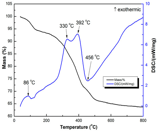 The TG–DSC curve of the MCTO-0 aerogel under air was tested to study its thermal decomposition behavior, which contained three mass loss stages, as shown in Figure 1. The first mass loss stage below 120 °C with an exothermic peak at 86 °C was due to the desorption of adsorbed water. The second mass loss stage in the range of 120–400 °C with two exothermic peaks at 330 °C and 392 °C was detected, which could be attributed to the removal of organic matter and the decomposition of metal oxide precursor. In addition, an endothermic peak at 456 °C was observed for the third mass loss step from 400 to 600 °C. There were mass loss and mass gain involved at this step. The former was caused by carbon burn-off in the temperature range of 400–600 °C, which was 8.2 wt % (from XPS results), and the latter was from the oxidation of Mn3O4 to Mn2O3 (2Mn3O4 + 1/2O2 = 3Mn2O3), which was 3.5 wt %. Therefore, a mass loss was observed at this step.