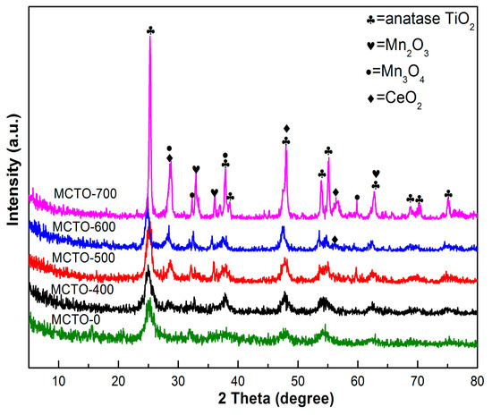 The XRD patterns of the MCTO-0, MCTO-400, MCTO-500, MCTO-600, and MCTO-700 are shown in Figure 2. The diffraction peaks at 25.3°, 37.8°, 38.6°, 48.1°, 51.0°, 55.1°, 62.7°, 68.9°, 70.3°, and 75.3° were observed for MCTO-0 sample, which were attributed to anatase TiO2 (JCPDS 21-1272) [11]. The characteristic peaks of the Mn3O4 phase (JCPDS 24-0734) at 28.9°, 32.3°, 38.0°, and 59.8° and the Mn2O3 phase (JCPDS 33-0900) at 32.3°, 35.6°, and 62.3° were detected for the calcined products [38]. In addition, the diffraction peaks for the CeO2 phase with a cubic fluorite structure (JCPDS 34-0394) at 28.8°, 48.2°, and 56.7° appeared for samples MCTO-600 and MCTO-700 [4]. The mean crystallite sizes of the above different phases were calculated using the Scherrer formula, as shown in Table 1; it could be seen that the increase of calcination temperature resulted in the gradual increase in crystallite sizes for the above metal oxides. Significantly, according to the results of below XPS and H2–TPR, MnO2 species were found on the surface of all samples. However, one could not see any standard peaks ascribed to MnO2 in XRD patterns, suggesting that they were highly dispersed on the catalyst surface, which could be beneficial to the NH3–SCR activity.