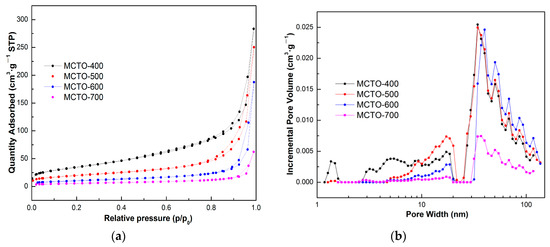 N2 adsorption/desorption isotherms (a) and the corresponding pore size distributions (b) of MCTO-400, MCTO-500, MCTO-600, and MCTO-700.