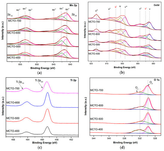 XPS spectra of the MCTO-400, MCTO-500, MCTO-600, and MCTO-700 catalysts: (a) Mn 2p, (b) Ce 3d, (c) Ti 2p, and (d) O 1s.