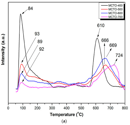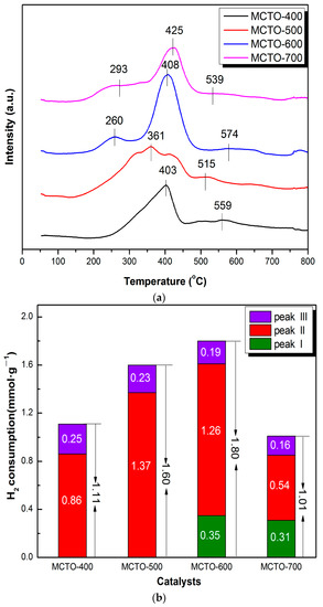 The H2–TPR technique was used to explore the reduction performance of the MCTO-x catalyst, and the obtained H2–TPR profiles and corresponding H2 consumption are shown in Figure 6a,b. The peak at 200–300 °C (denoted as peak “I”) was assigned to MnO2→Mn2O3 for the MCTO-600 and MCTO-700. The peak at 300–500 °C (denoted as peak “II”) corresponded to Mn2O3→Mn3O4 for all samples. For the MCTO-400 and MCTO-500, the reduction at 200–300 °C corresponding to MnO2→Mn2O3 was not well resolved with no apparent peak found. This could be caused by a smaller number of the high valence Mn4+ at a lower calcination temperature. The peak at 500–600 °C (denoted as peak “III”) was attributed to the reduction of CeO2 to Ce2O3 or surface Mn–O–Ce species [22]. As shown in Figure 6b, as the calcination temperature increased, the total H2 consumption of the catalysts increased firstly and then decreased. The MCTO-600 had the best reducibility, but its absolute surface Mn4+ content was not the highest, which might be due to the fact that the accessibility of the X-ray for the surface of samples by XPS was different from that of the reactants, and that the former had a higher accessibility than the latter. With increases in the calcination temperature, the number of the high valence ions can increased, and therefore the total H2 consumption can increase. The decrease of the total H2 consumption beyond 600 °C can be caused by the growth of crystallite size due to sintering and the decrease of the number of available reducible species. As the total H2 consumption of the MCTO-600 exhibited the largest of 1.80 mmol g−1, therefore, its low-temperature NH3–SCR activity was the highest among the four samples, indicating that the reducibility of active species favored the improvement of the NH3–SCR activity [14,18,38].