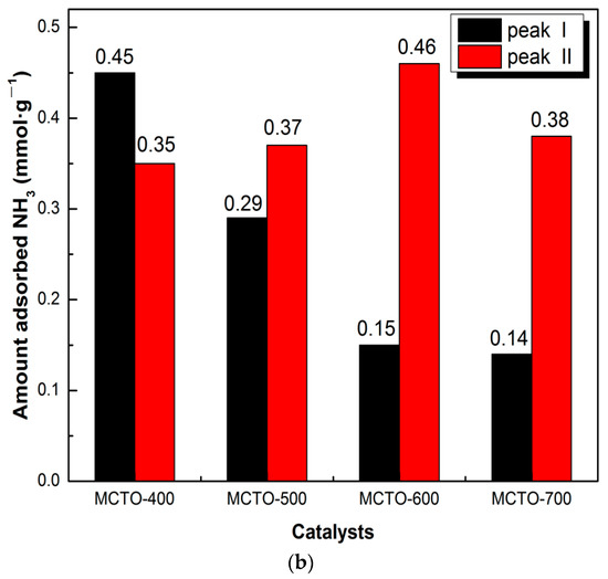 NH3–TPD profiles (a) and the corresponding amount of adsorbed NH3 (b) of the MCTO-400, MCTO-500, MCTO-600, and MCTO-700 catalysts.
