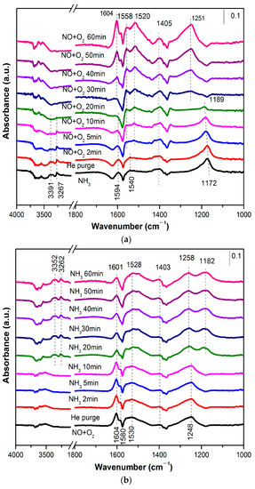 In addition, a new band at 1258 cm−1 may belong to the surface ammonium nitrate, which originated from the dimerization of NO2 and the continuous reaction with NH3 and H2O [19,53]. It has been confirmed that NH4NO3 is also an important intermediate component in the NH3-SCR process, along the following reaction route: NH4NO3 + NO→NH4NO2 + NO2, NH4NO2→N2 + 2H2O [54]. The presence of NO2 species demonstrated that a high ratio of Mn4+/Mn facilitated the oxidation of NO to NO2.