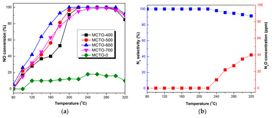 NH3–selective catalytic reduction (SCR) activity of MCTO-0, MCTO-400, MCTO-500, MCTO-600, and MCTO-700 catalysts (a). N2 selectivity of MCTO-600 (b). Reaction conditions: 500 ppm of NO, 500 ppm of NH3, 5 vol. % of O2, balance N2, gas hourly space velocity (GHSV) = 14,400 h−1.