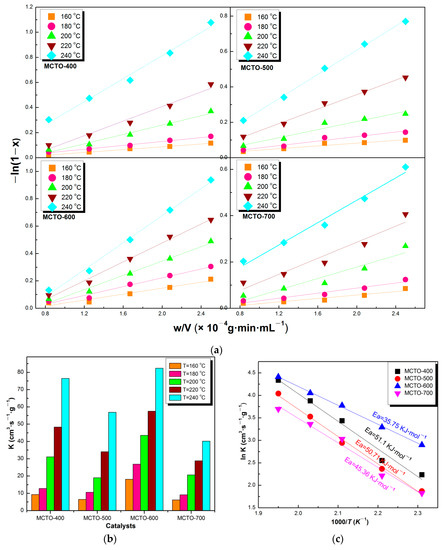 −ln(1 − x) versus w/V plots (a), reaction rate constant (b), and Arrhenius plots (c) of MCTO-400, MCTO-500, MCTO-600, and MCTO-700.