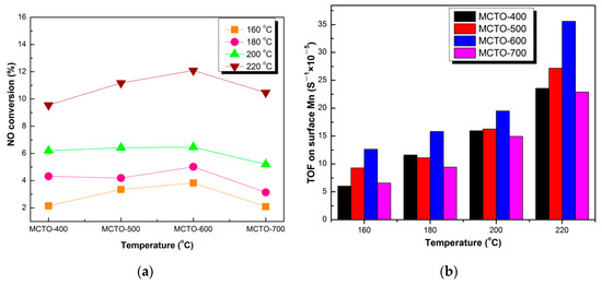TOF was used to further compare the intrinsic activity of the catalysts at 160, 180, 200, and 220 °C, respectively, which was calculated based on the atomic percentage of Mn (the main active site) on the surface. As shown in Figure 11a,b, it can be seen that MCTO-600 presented the highest TOF value compared with that of MCTO-400, MCTO-500, and MCTO-700, which was 12.64 × 10−5·s−1 at 160 °C, 15.83 × 10−5·s−1 at 180 °C, 19.51 × 10−5·s−1 at 200 °C, and 35.57 × 10−5·s−1 at 220 °C, further demonstrating that NO conversion on the MCTO-600 was highest, in accordance with the results from the activation energy.