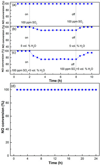 Meanwhile, the H2O resistance of the MCTO-600 catalyst was also investigated, as shown in Figure 12b. When 5 vol. % of H2O vapor was introduced into the system, the NO conversion decreased from 100% to 90% in the first 2 h and remained stable for the next 4 h, which returned to 100% after the H2O vapor was cut off, which may have been due to the fact that the adsorption of H2O at the active sites was reversible, and the occupied active sites could be easily regenerated after H2O desorption [55,57]. When 100 ppm of SO2 and 5 vol. % of H2O vapor were injected into the flue gas simultaneously, as shown in Figure 12c, the NO conversion of the MCTO-600 catalyst reduced from 100% to 75% within 2 h and remained stable for the next 4 h, which then gradually increased from 75% to 95% within 2.5 h after SO2 + H2O was cut off, suggesting that the passivation of the catalyst by SO2 + H2O included reversible and irreversible parts [58]. These results indicated that the coexistence of SO2 and H2O vapor at a low temperature had a greater impact on the NO removal than that of SO2 alone, which may have been due to the fact that H2O can accelerate the deposition of sulfates on the surface of catalyst, thereby intensifying the poisoning of SO2 [59,60]. In addition, the stability and longevity of the catalyst are also important for practical applications, as shown in Figure 12d; the NO removal efficiency of the MCTO-600 catalyst was stabilized at 100% within 24 h under the test conditions, demonstrating its excellent long-term stability.