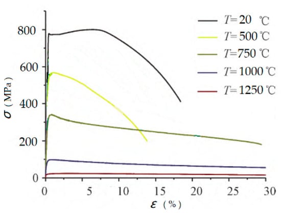 Five sets of specimens for uniaxial tensile tests were abstracted from butt–joint in terms of tensile test methods on the weld and deposited metal (GB/T 2652-2008/ISO 5178: 2001). Each set has three specimens for the consideration of taking an average. The uniaxial tensile tests were conducted at temperatures of 25 °C, 500 °C, 750 °C, 1000 °C, and 1250 °C, respectively. It was found that the three stress–strain curves recorded at five different temperatures were comparable. Typical real relationships between stress and strain are depicted in Figure 1.