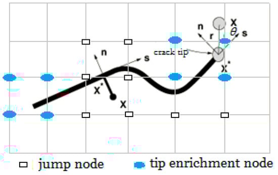 According to the concept of the partition of the unity method [16,23], the presence of a crack is expressed using enrichment functions linked with additional degrees of freedom (DoFs), as depicted in Figure 3.