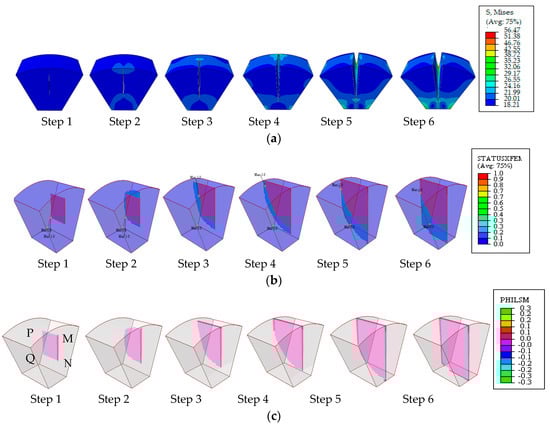 Figure 4a depicts the evolution of the stress contour with high values at the crack front, indicating that the crack front is always the exact site of stress concentration. The variable of StatusXFEM represents the damage status varying from 0.0 to 1.0, with 0 for new surfaces and 1 for completely damaged ones, as shown in Figure 4b; the value of PHILSM of 0 denotes that the signed plane is exactly at the crack surface, as shown in Figure 4c. The upper tip M is the first to experience maximum principal stresses up to the point of damage. Subsequently, the crack front propagates upward, reaches the weld’s upper surface, develops along the weld’s upper surface until it has gone through the weld thickness, and finally, the lower tip N initiates and develops downward to the lower surface; i.e., there is a total four crack-tip failures in the sequence of M > P > N > Q.