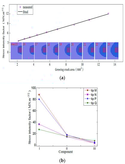 SIFs can be readily calculated with the result of the XFEM modeling in terms of the displacement–extrapolation method listed in Equations (5) and (6). The areas of cracked surfaces and SIFs at each approximate incremental time step were calculated, as shown in Figure 5a. The SIFs show fairly good linear correlation with the cracked area, qualifying SIFs as an effective fracture parameter when linked with the driving force of solidification cracking. In fact, in the long crack case, SIFs are known to be effective [27]. This linear quantitative relationship between the cracked area and SIFs can be attributed to the dominant brittle nature of solidification cracking, and is in good agreement with the observations [21,22]. Therefore, the SIF was utilized to characterize the crack singularities in terms of the local crack-opening displacement.