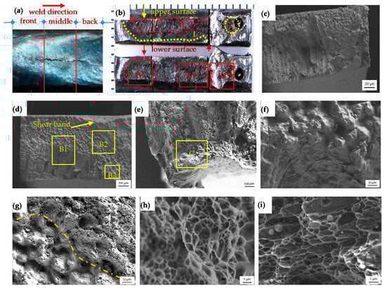 It is worth noting that the boundary region of the solidification crack, labelled as B2 in Figure 6d and magnified in Figure 6g, shows two discrepancy morphologies—coarse and shallow dimples and dense and deep dimples introduced by thermal weld stress and forces in the three-point bending test, respectively. Those two morphologies even can be distinguished by a smooth curve, suggesting that the solidification crack was interiorly arrested by the weld matrix rather than propagated through the lower surface. Moreover, a small inner solidification crack was observed with an area less than 1 mm2 and kept close to the weld surface (Figure 6b in yellow dotted ellipse).