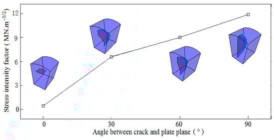 Initial defects were usually observed to tilt to weld plate plane [13,26,33], which is expected to weaken the loading capability in both the thickness and transverse directions. The inclined angles of the initial defect susceptible to solidification cracking were investigated with the cases of 30° and 60° together with the cases of 0° and 90° for comparison, as shown in Figure 8. It can be seen that the KI increases with the tilted angle, and the initial defect vertical to the weld plate plane yields the highest susceptibility to solidification cracking. Meanwhile, it is interesting to see that no matter the angle at which the initial defects tilt, the defects uniformly advance in a direction almost vertical to the weld plate plane, enabling the crack to appear longitudinally and centerline-oriented at the weld surface. Those predictions highlight the dominant role of the weld’s transverse stress component in driving solidification cracking rather than the stress component in the thickness direction. Similar observations are also available in [13,23] and in shipbuilding engineering. This prediction is also in agreement with the observation derived from PFM that as the grain boundary angle to the weld centerline increases, the susceptibility to solidification cracking increases [33]. The weld’s transverse stress component is therefore proven to contribute to the longitudinally centerline-oriented appearance of the solidification crack.