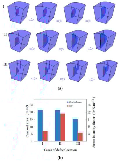 To illustrate the preferred path of solidification crack propagation, in the longitudinal direction, except for the current-positioned initial defect simulating the insufficient feeding or impurity-tracking forward electrode, there are two other scenarios of initial defect positioning: One is that the insufficient fluid feeding or impurity is terminated at the current cross-section, and thus, a closed initial defect forms; another is that after a sudden termination, insufficient liquid feeding or impurity resumes, and separated defects form [26], as shown in Figure 9a(I,III), respectively. Given those two scenarios of initial defect positioning, their cracking behaviors were modeled. For comparison, the scenario of the current-positioned initial defect is exhibited simultaneously. All scenarios assumed the same areas for the initial defects.