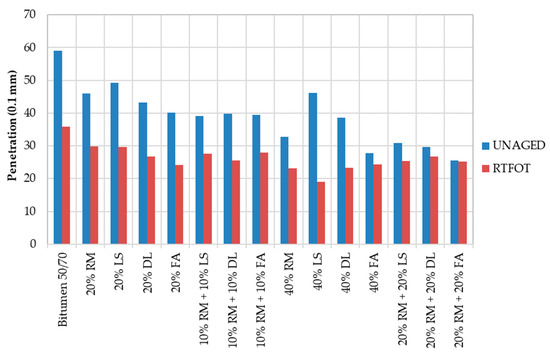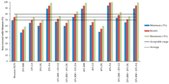 In Figure 9, it is possible to compare the results obtained with those for bitumen 50/70, which is considered the reference. Two additional columns were created considering the results obtained in the adhesiveness test. The superior column had +5% and the inferior column −5%. The reference lines are based on the bitumen 50/70 results.