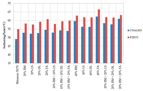 The softening points of the mastics are given in Figure 4. As shown, the more filler, the stiffer the material. The 40% LS also has a big gap between the unaged and aged results. However, in Figure 4, the 40% FA is shown to be the mastic with the greatest viscosity. In both Figure 3 and Figure 4, the reference bitumen presents the highest viscosity.