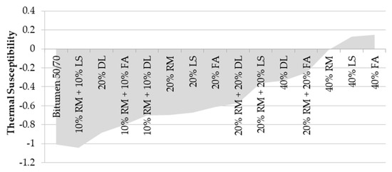 The lower the index, the lower the thermal susceptibility. The index ranges between −1.5 and +0.7. Values greater than +1 indicate oxidized asphalts (poorly sensitive to high temperatures); values lower than −2 indicate very temperature sensitive asphalts. Figure 5 shows the thermal susceptibility index calculated for the mastics.
