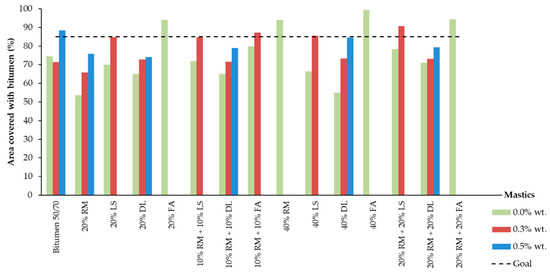The only samples without additives that achieved the 85% required by the standard were the 20% FA, 40% RM, 40% FA, and 20% RM + 20% FA. The mastic with 10% RM + 10% FA almost reached the minimum value, with 80% of the aggregates’ area covered.