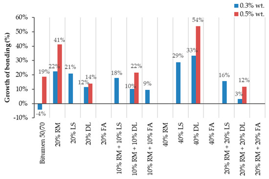 Figure 8 shows the growth of the bonding values after adding 0.3 and 0.5 wt % of additive, taking as reference the samples without additive. As shown, the highest influence of the additive occurred on mastics with dolomite and 20% RM.