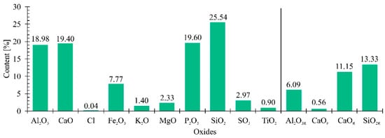 Moreover, previously mentioned standards [42] require the content of the reactive SiO2 to be higher than 25%, reactive CaO lower than 10%, MgO lower than 4%, and Na2O lower than 5% by weight. For the tested FAMSS, the content was 13.33, 11.15, 2.33 and 0%, respectively. The set requirements were not met for reactive SiO2 and reactive CaO; the standard applies, however, to siliceous fly ashes obtained during the combustion of coal or co-combustion of coal and waste. In addition, compared to calcareous and siliceous fly ash, it has been noted that FAMSS contains significantly higher amounts of phosphate, which also exceed the required value of a maximum 100 mg/kg [46]. This is due to phosphorus removal from the wastewater and its accumulation in sewage sludge. It is worth emphasizing that these results are consistent with those presented by Tarko et al. [56]. Additionally, the loss of ignition, expressing the content of unburned coal in a given sample of FAMSS sludge, was 0.53%. It is connected with the technology of combustion of municipal sewage in the fluidized bed furnace, and with the combustion temperature exceeding 850 °C.