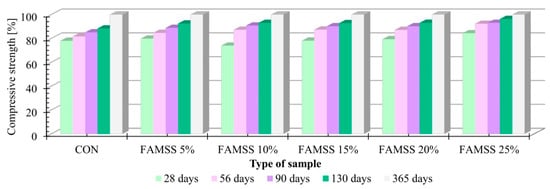 After the first measurement, i.e., after 2 days of curing, the tested concrete obtained from 39% (FAMSS 10%) to 44% (FAMSS 25%)—and after 7 days from 58% (FAMSS 15%) to 71% (CON)—of the final strength determined after 365 days of maturation. After the next period of cement maturation (28 days), the reference concrete had 78% of the final (annual) compressive strength, while in concretes made with FAMSS, the compressive strength accounted for 74–84% (Figure 4). After 56 days of curing, the reference concrete was characterized by the largest increase in compressive strength. In the interval between 28 and 56 days of curing, the concretes with the addition of fly ash, despite a small increase in strength, had already obtained from 84 to 92% of the final strength. The obtained test results may indicate the pozzolanic activity of FAMSS. Figure 4 presents the relative changes of compressive strength in relation to maturation period for individual concrete, only for maturing times equal to and longer than 28 days, i.e., for times enabling achieving operational parameters. According to Autors [59,63], the presence of ashes at an amount of 25% by weight slows the grout setting process and weakens the compressive strength of mortars and concretes in comparison to composites made using only Portland cement. However, faster compressive strength growth was observed in our research for FAMSS 25% compared to control sampling.